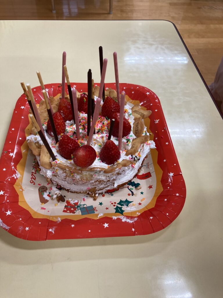 12月24日はクリスマスケーキ作り、12月25日はクリスマス会を行いました。