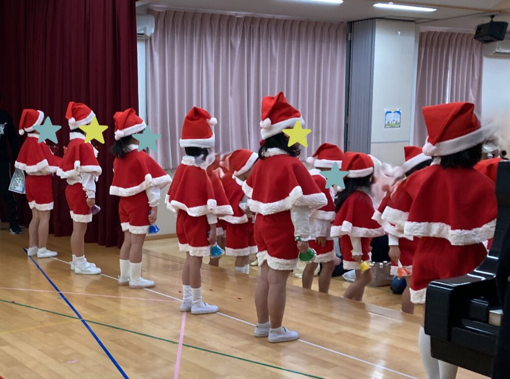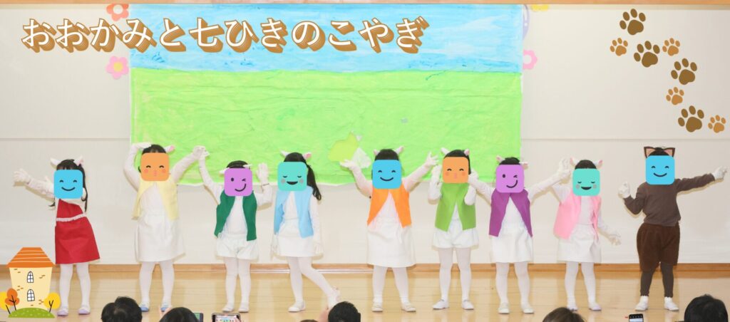 🔔発表会👦👧🎵 12月13日に発表会を行いました☺ みんな本番までたくさん練習してきました!! 大勢の保護者の皆さんが来園して下さり、大変嬉しく思います。 とても可愛い衣装を着たり、歌に合奏、劇、遊戯と、緊張しながらも 一生懸命披露しました😺🐰🐼🐘 ハンドベルで2曲演奏しました☺ 発表会の看板はブレーメンの音楽隊です♪